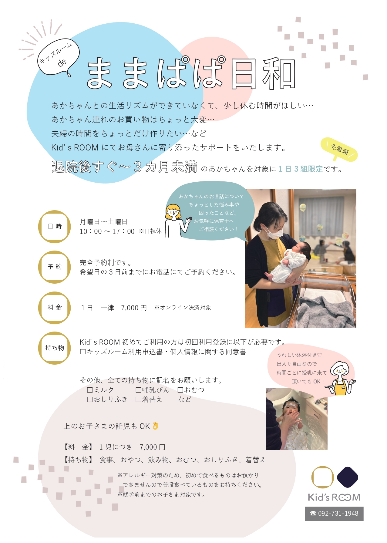 退院後すぐ~3か月までのあかちゃんをキッズルームにてお預かりし、